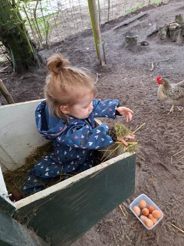 Het is vooral handig dat het water en wind dicht is, bijvoorbeeld op de fiets. Mijn dochter speelt bij mijn moeder zoals je kunt zien bij het kippenhok, waar ze dan ze kippen mag voeren. Het pak vind ik ideaal mocht er per ongeluk ergens poep liggen 😅. Of als ze in de plassen/modder speelt in de tuin.
