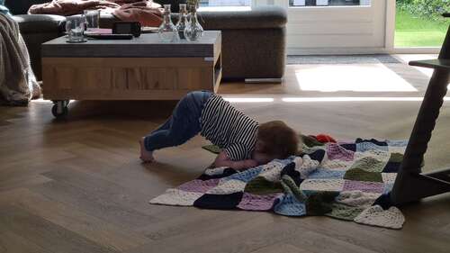 Mijn dochter doet het ook. Maar gooit dan ook nog haar kont omhoog zodat ze meer in een yoga houding staat.. en dan zakt ze op haar knietjes.. of het word te zwaar en zakt door haar armpjes waardoor je zoals op de foto krijgt