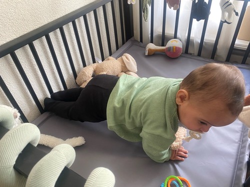 1 van mijn meiden doet met haar benen een combi van schoolslag en push-ups maar lijkt de kracht te missen om ook armen te strekken. Hierdoor heb ik het vermoeden van een soort van voorbereiding op kruipen.