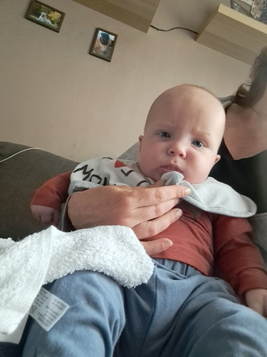 Hier zit hij al veel rechtop en wil graag staan. Als ik hen liggend terug z ...