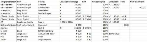 3/3: heb trouwens alleen de zorgverzekeraars meegenomen die poliklinisch volledig vergoeden, omdat ik nog niet weet waar ik wil bevallen. Als je 't volledige overzicht wilt met alle verzekeraars, mag je me gerust een berichtje doen