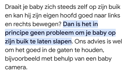 Mijn zoontje is bijna vijf maanden, ligt hele dag zowat op zn buik, hoofd 90 graden omhoog dus hij kan goed zn hoofd omleggen hij slaapt nu ook op zn buik