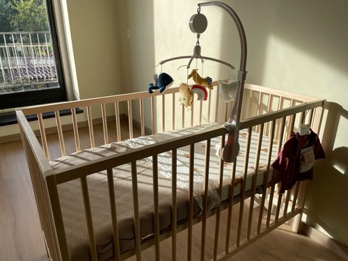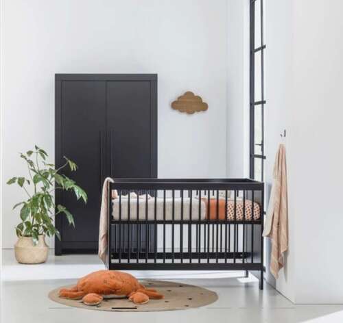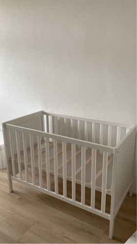 De bestseller van IKEA. Je kan hem ook ombouwen en 1 zo’n zijkant eruit halen zodat ze zelf in en uit bed kunnen als ze groter zijn. Ideaal vond ik dat. Ik hou zelf van basic en strak dus vond dit een perfect ledikantje.