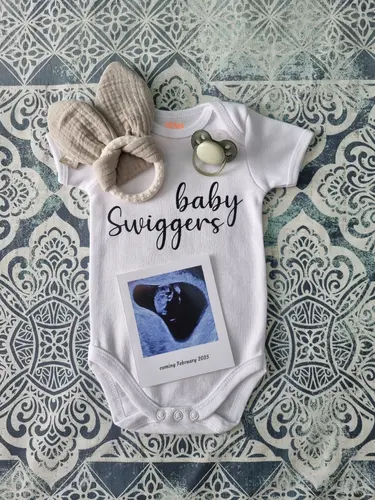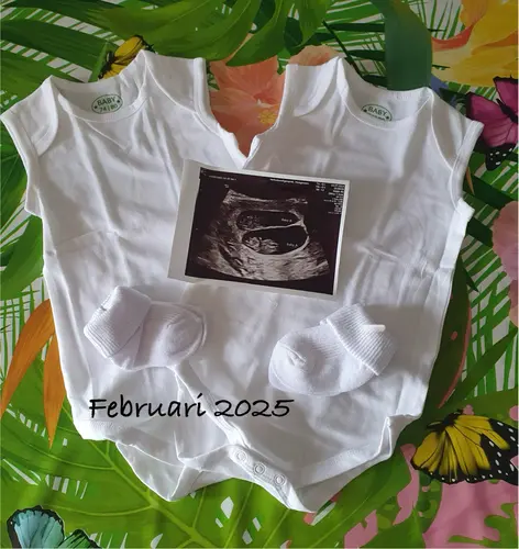 De rest van familie en vrienden gaan we na onze 12w echo op de hoogte brengen. Voor op fb en insta heb ik al een foto gemaakt met een gepersonaliseerd rompertje en dan de foto van onze eerste echo.