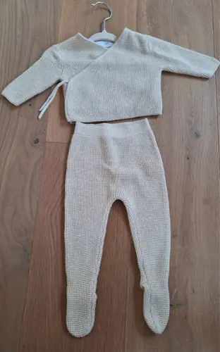Het zit ergens in een doos, zou even moeten gaan zoeken. Het is een effen beige, heel fijn gebreid pakje met peer motief in. Overslag truitje en broekje met voetjes (als ik me niet vergis).