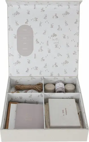 Ik heb er eentje gekregen als kraamcadeau! Van Little Dutch. Het is een stevige doos van karton met hele mooie bewaaropties. Little Dutch memory box bunny heet het
