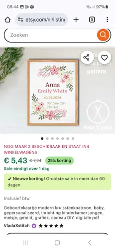 Ik heb tijdens mn vorige zwangerschap een geboorteposter geborduurd. Doe het nu ook voor de tweede. Het is zoiets als onderstaand . Je koopt het patroon en dan kwestie van borduurstof en garen halen. Het heeft me echt wel +100uur gekost, maaar het is enkel een kruissteek dus geen hogere wiskunde. Uiteindelijk een mooi resultaat wat ook echt een herinnering blijft