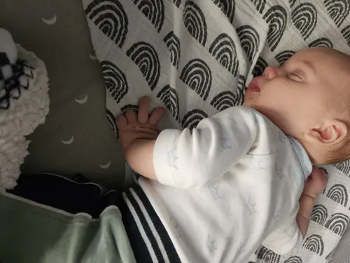 Ik had gisteren een korte mouwen romper, shirt met korte mouwen en een lange broek aan getrokken. Hier had de kleine het heerlijk mee. Vannacht een wollenrompertje met lange mouw en een tog 1 slaapzak. Meneer sliep voor het eerst 7u achter elkaar dus was helemaal goed.