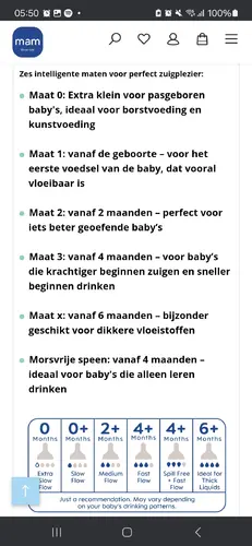 Deze aangeschaft omdat die vanaf 2 maanden is (hij is nu 13 weken) en omdat hij steeds meer begon te drinken dus de 130ml werd krap. De speen hierop is ook n slag groter dan op de kleine fles dus ik denk maat 2?