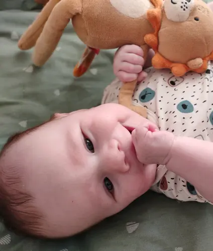 Hier ook totaal niet bezig met grijpen of rollen. Vind momenteel je intens aankijken, lachen, je volgen en brabbelen veel leuker. Hele verhalen horen we .. tummy time vindt hij nu wel steeds leuker. Ik heb wel doekjes die ik in xn hand doe zodat hij die even kan vasthouden en dan doe ik helemaal vrolijk maar nog niet leuk genoeg maar de natuur bepaald zelf het tempo@