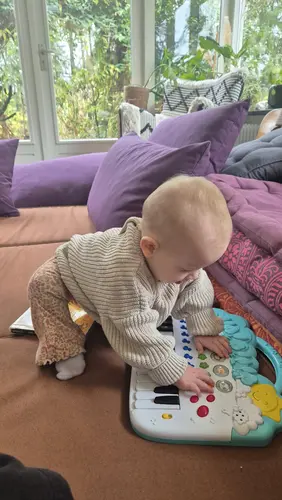 De knoopjes van een jas of vest is het beste vermaak hier 🤣🤣 als ze bij je op schoot zit kan ze hier mega lang aan peuteren met die kleine vingertjes en is ze fully focus. Terwijl de box vol zit met speelgoed waar ze alleen mee gooit 😂😂