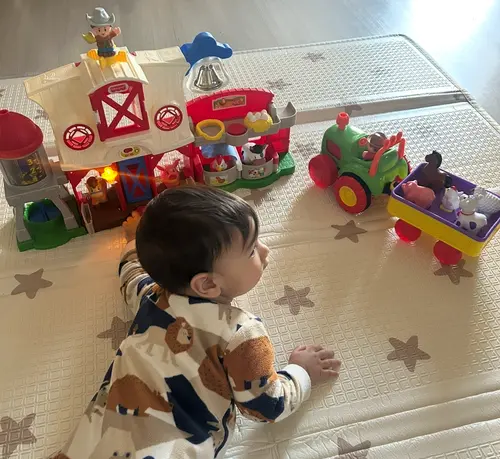 De tractor van de Action (hierdoor ging hij uiteindelijk kruipen) en de verzorgboerderij van Fisher Price