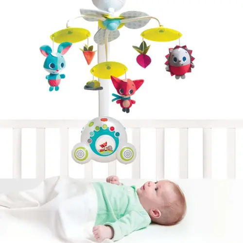 Bij ee eerste begonnen we met een pastelroze nijntje mobiel. Prachtig in de woonkamer, kind vond dr geen klap aan haha. Daarna een van Tiny Love opgehangen en kind vond het geweldig. Kon er heel lang naar kijken. Foto is van bol.
