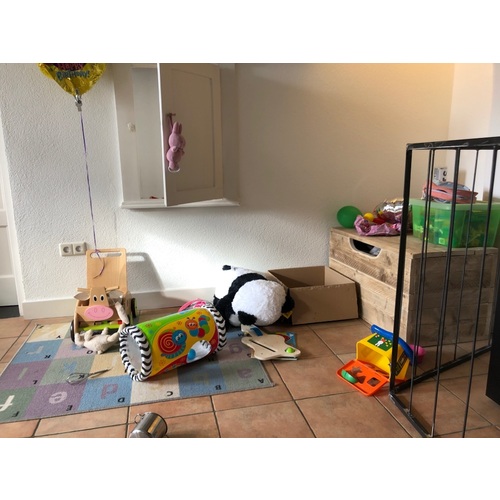 Wij hebben de box weg gedaan en een ronde ballenbak neergezet haha echt een aanrader! Daarnaast hebben we gewoon 3 mandjes van de leenbakker staan daar zit al het losse speelgoed in