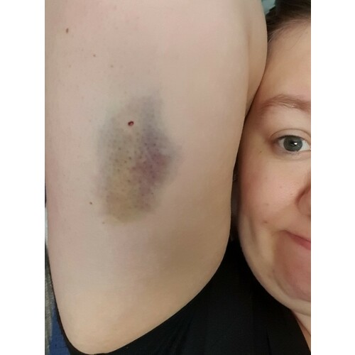 Ik heb een implanon laten plaatsen 26 maart dus vrij recentelijk. Die heb ik laten zetten op dag 2 van mn menstruatie. Tot zover gaat het goed en ben ik tevreden. Soms is het nog wat gevoelig als ik er lompen gewicht overhen schuif maar dat is logisch. En ook tot dusver geen bloedingen tussendoor gehad maar dat kan nog gebeuren. Ik hoop 1 op die 5 te zijn zonder menstruatie en bloedingen maar we zullen het zien de komende tijd. Blauwe plek van plaatsing is nu ook bijna weg. De foto is van 2 dagen na de plaatsing (niet schrikken ziet er lelijker uit dan het voelt)