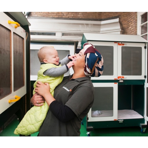 Het voordeel van zo'n bedje is dat het echt maar aan een kant (de voorkant) open is, waardoor het kindje beschut is tegen wind en regen. Zo kunnen ze nog steeds buiten slapen als het vriest!