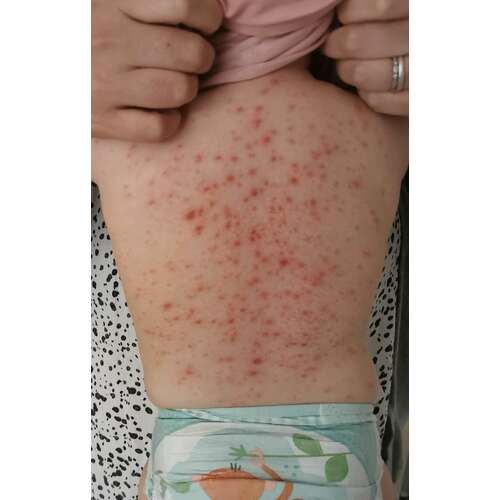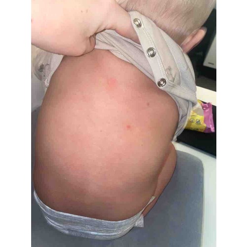 Hier een jongetje wat 3.5 week koorts had en denk 2 weken later wat kleine lichte bultjes op de benen. 1 week later bij zijn oren en op zijn schouders en hoofd en nu al wat meer op zijn romp vooral bij de luier sluiting.