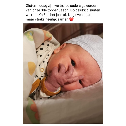 Ik heb hier ook volop van tevoren over nagedacht en wat teksten in mijn notities gezet. Uiteindelijk heb ik me laten leiden door het moment. Onze baby is 5 over half 1 s nachts geboren en heel die nacht voelt als een grote waas. Ik weet wel dat ik s morgens nog steeds wakker was en verliefd naar hem aan het kijken was (nog vol adrenaline van de bevalling). Uiteindelijk heb ik hem s morgens vroeg geplaatst op fb en ter plekke een korte, krachtige tekst erbij getypt vanuit mijn hart. Als ik het terug lees voel ik nog steeds die emotie. En de tekst was zo kort en simpel maar oh zo krachtig, zou deze van tevoren nooit bedacht hebben. Wellicht laten leiden door het moment als je kleintje er is?