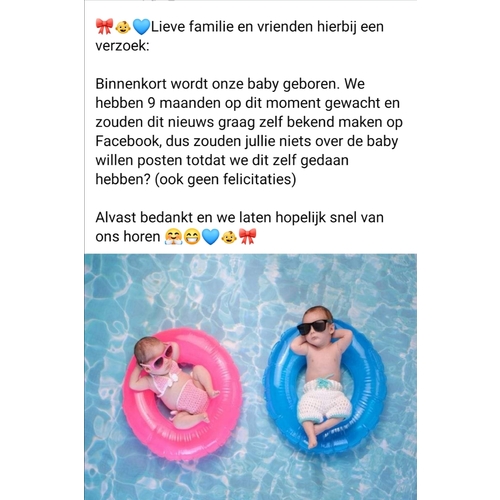 Dat is een mooie, denk dat ik die ga gebruiken. Mijn zus had meteen of Facebook gezet dat ik zwanger was nog voor ik het kon doen. Ze was de laatste die ik het vertelde, kwam omdat ze elke keer het afspreken uitstelde, uiteindelijk via what's app video verteld. Binnen 2 minuten had ze het geplaatst bam en bedankt. Nu wel gevraagd of ze niks wil plaatsen maar waarschijnlijk negeert ze dat toch.