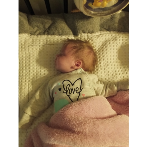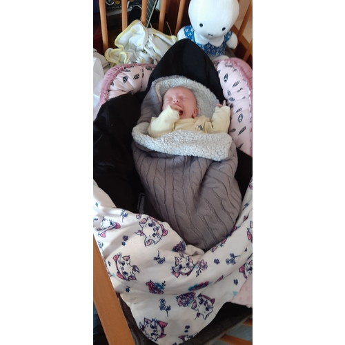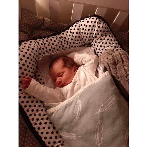 Onder het baby nestje ligt een boxkleed. Dan babynestje dan mijn trui voor geur als ze met papa naar beneden gaat smorgens. En dan in een heerlijke warme zak die we normaal gebruiken voor in de maxicosi en geen kruik meer want ze houd haar warmte goed vast inmiddels. En ze is 5week oud in het begin met kruiken en de marie deken er nog over heen