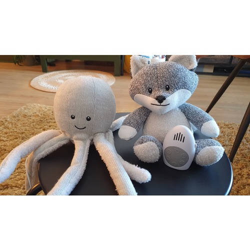 Het vosje heeft een geluid sensor. Als de baby huilt dan gaan hij aan. Deze heeft een paar geluidjes waaronder hartslag en regendruppels. Geen White noise.