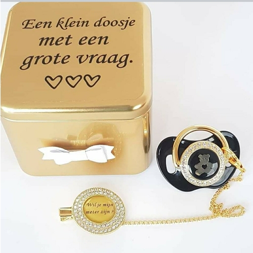 Wij hebben de cadeautjes besteld op onderstaande site. Voor de meter kochten we een boomstam met theelichthouders waarop stond "wil jij mijn meter worden" en voor de peter kochten we stickers met "wil jij mijn peter" zijn voor op bierflesjes van karmeliet. Was heel makkelijk zelf te kleven :) https://www.decadeaushop.be/geboorte-doop#filter:6887194d37542aef9e6202f2f5cfb457