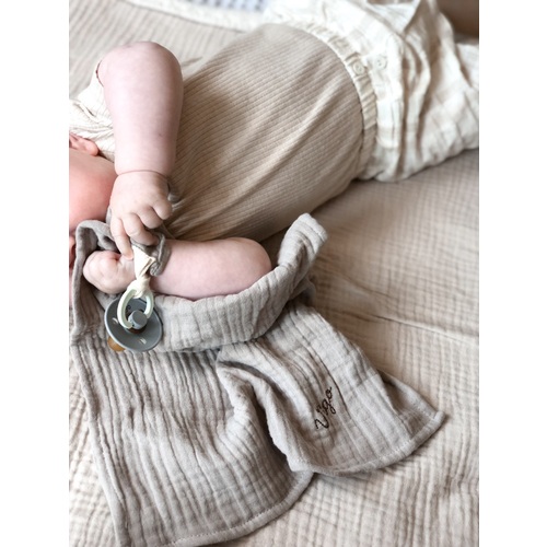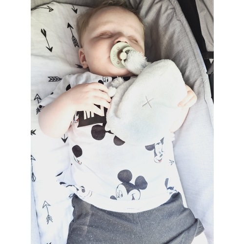 Hij heeft 2 van deze knuffeltjes. 1tje in z'n bed waar hij mee slaapt en in de andere heb ik in het oor een drukknoopje laten zetten. Zo heeft hij altijd een speen en knuffel mee als we buiten zijn.