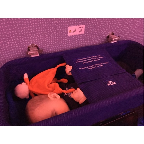 Oh en hangt af van welke maatschappij je vliegt maar sommige maatschappijen hebben echt babybedjes die ze aan de muur kunnen monteren. Is belangrijk om ver van te voren te vragen zodat je een goede plaats hebt waar dat kan. Wij hadden dat op de laatste vlucht naar huis en het was echt geweldig. Meneer heeft heel lang geslapen en wij hadden onze handen vrij.