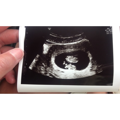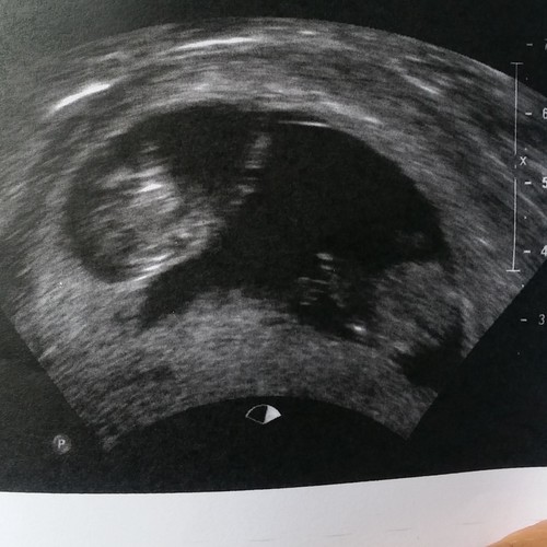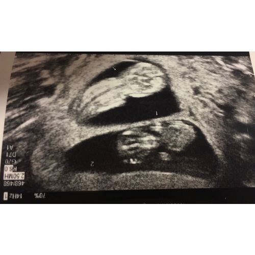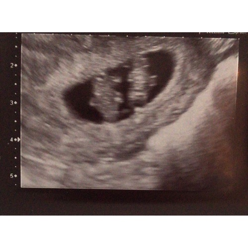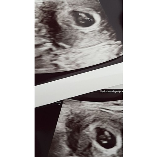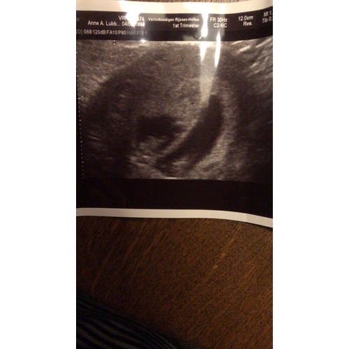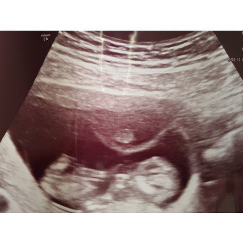 Bij de eerste rond 6 weken zag de gynaecoloog een hartje kloppen, ik merkte dat ik een beetje een raar gevoel had en teleurgesteld was zo raar, want enorm dankbaar met de zwangerschap. Bij 8 weken keek de gynaecoloog vrij lang en dacht ik even dat er iets mis was en toen feliciteerde ze ons met een tweeling! Ze bleken heel dicht bij elkaar te zitten, en op de eerste echo achter elkaar. Dit was de foto van de echo rond de 8 weken:
