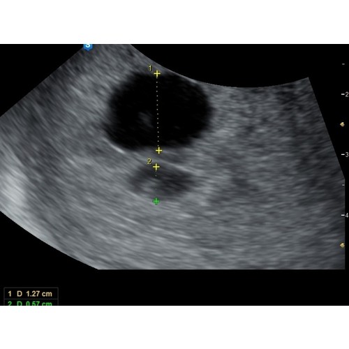 Durf het niet te zeggen als het zo is misschien een eeneiige tweeling? dit was bij mij de echo met 8 weken. bij 7 zag ze alleen zoals de bovenste 2x een zwarte holte. De bovenste is bij 5 weken gestopt met groeien de ander doet het prima nu 12 weken. Anders waren het een twee eiige tweeling geweest.