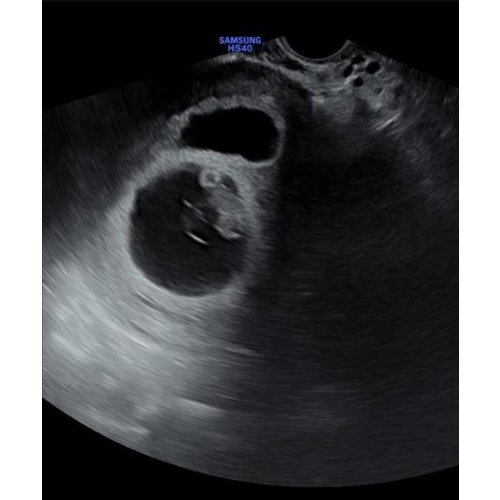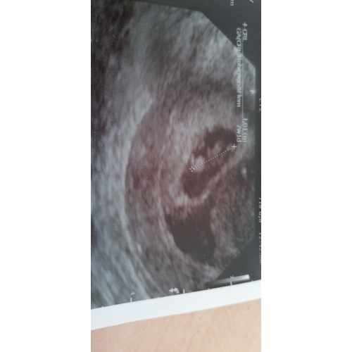 Ik moest even zoeken maar dit is met 7 weken echo. Ik was zwanger van een tweeling en mijn buik groeide ook onwijs snel. Uiteindelijk bleek dus vanaf 5 weken het al niet meer verder gegroeid te zijn en had ik continue op en af bloedingen die bij week 8,5 gestopt zijn naar het uitplaatsen van het vruchtzakje. De Gyneacoloog gooide het toentertijd op een “vochtophoping”