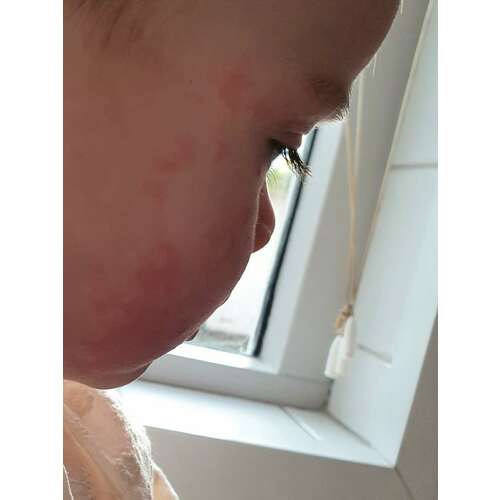 Als het alleen in het gezichtje is kan het misschien ook zijn dat de huid reageert op het zuur van deze voedingsmiddelen. Verder geen reactie in de mond, dikke lippen o.i.d.? Huilen?