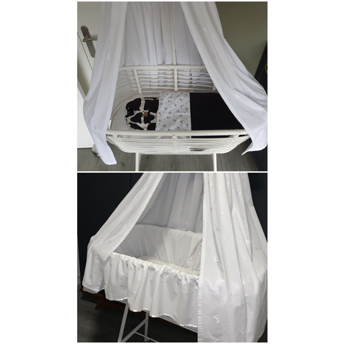 Ik heb het even aan mijn kraamverzorgster nagevraagd, omdat onze wieg ook is bekleed. Zij gaf aan dat dit gewoon mag, het is meer dat er geen soort stootkussen tegen aan mag.