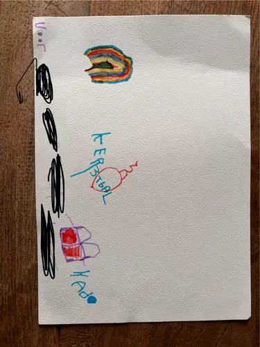 Hier kan ze inmiddels lezen en schrijven (maakte vandaag toevallig bijgevoegde tekening toen we ergens op bezoek waren. Onderin heeft ze al onze namen nog geschreven achter ‘voor’), rekenen tot 10, veel verschillende dingen tekenen zoals poppetjes, regenbogen, luchtballonnen, een hoop dieren, etc. Kloklezen lukt op de hele uren nu.
