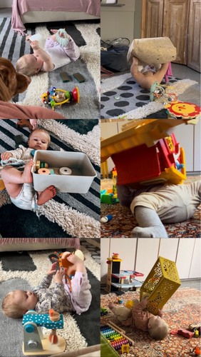 De afstandsbediening en gsm zijn hier ook favoriet 😂 Maar verder speelt ze met alles eigenlijk. Vooral de klimdriehoek is nu erg populair, optrekken en op de eerste trede gaan staan, dat vindt ze erg leuk. Knisperboekjes, hoe luider hoe beter. We hebben een piano van Bumba, normaal voor kindjes van een jaar, maar die vindt ze ook echt leuk.