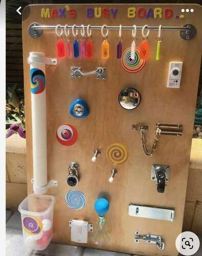 Ik heb zoiets gemaakt alleen dan met allemaal makkelijke sloten, dingetjes met geluid en licht en stekkers en gespjes etc. Van alles wat en hij vermaakt zich er goed mee.