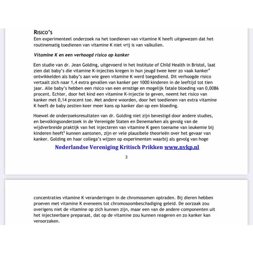 Voor mensen angstig worden. Er nog verschillende andere onderzoeken gedaan naar het verband tussen vitamine K injecties en kanker/leukemie, maar is bij die andere onderzoeken geen significant bewijs gevonden dat er een verband zou bestaan. Zoals je in de wetenschap leert: één onderzoek is geen bewijs. Je hebt meerdere onderzoeken nodig die de hypothese bevestigen en dat is hierbij niet het geval.