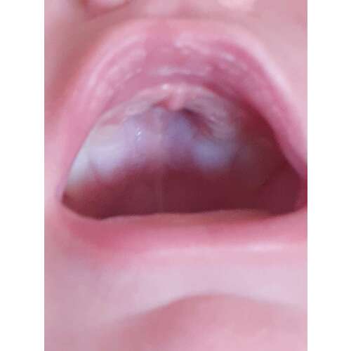 Mijn zoontje heeft een wit gehemlte. De ene dag witter dan de andere. Foto van vandaag is een milde dag, soms is het groter en spierwit.