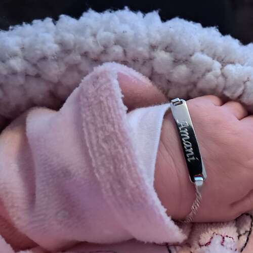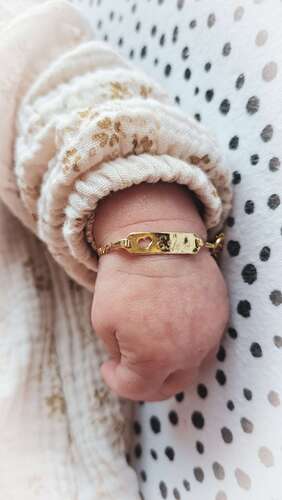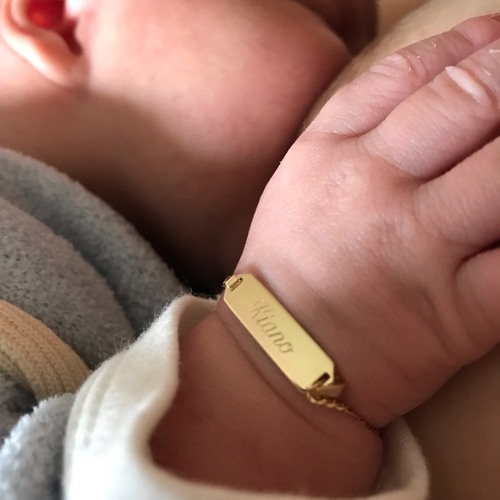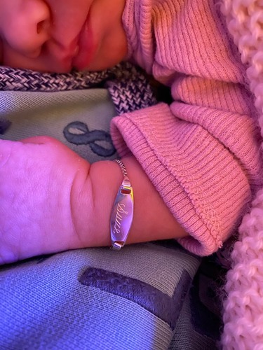 En heel toevallig is het lettertype van armbandje en babykaartje hetzelfde! Ze konden het lettertype niet weten, want de kaartjes waren nog niet binnen toen ze het armbandje gaven
