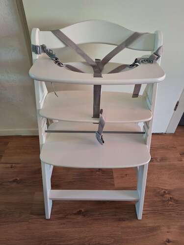 Wij hebben de stoel ook al iets eerder omgebouwd, maar vooral om haar zittend te kunnen laten eten. Ze kon toen met ondersteuning wel redelijk zitten en ik heb toen de afweging gemaakt wel de kinderstoel te gaan gebruiken, omdat ik niet nog langer wilde wachten met hapjes. Ze zat er toen alleen echt voor het eten in. Nu ze goed zit, zet ik haar ook wel eens tijdens het koken in zodat ze naast me kan zitten.