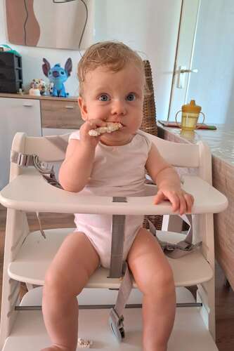 Hier is ze nu 8,5 maand en zit nog niet. Ik vind haar nog te onstabiel om in die stoel te doen. Maar kijk er wel enorm naar uit 馃グ
