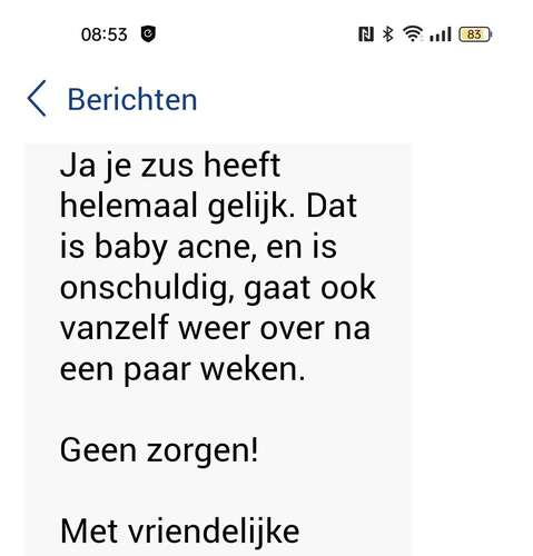 Hier had onze 1e dochter ook extreem veel baby acne in het gezicht. Dachten ook aan KMA maar bleek na 4weken weg te zijn dus was het baby acné. Versta wel de twijfel dus mss wel in de gaten houden of er andere klachten zijn