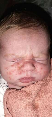 Na wat gegoogled te hebben kom ik bij babyacne of koemelkallergie.