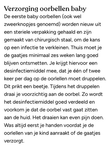 Bij mijn dochter heb ik het toen der tijd nog jonger gedaan. Alleen dan bij een piercer. Die zei tegen mij 2 keer per dag draaien en verder niet aankomen of schoonmaken. Aangezien baby’s niet vies zijn en er niet mee vieze handjes aan gaan zitten kan je er het beste zo weinig mogelijk mee doen. Wanneer het zou gaan irriteren moest ik zelf met zout mengen in water en het daarmee schoonmaken. Dit is nooit nodig geweest want het is nooit gaan ontsteken. Nu is het een dame van richting de 3 jaar die heel trots is op haar oorbellen en elke keer wil wisselen van oorbellen. Zo leuk 🥰