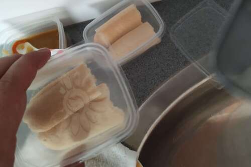 Het ei werd nu door een potje eten vermengd. Ik moest 200 gram eten meenemen en dit heeft hij in stappen gekregen gedurende de ochtend.