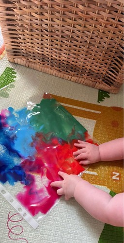 - ziplockzakjes/lamineerhoezen met babyolie en voedselskleurstof