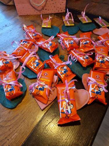 Ik heb sleutelhangertjes gemaakt van vilt in hartjes en blaadjes met dreumesbeschuit en voor de leidsters met merci