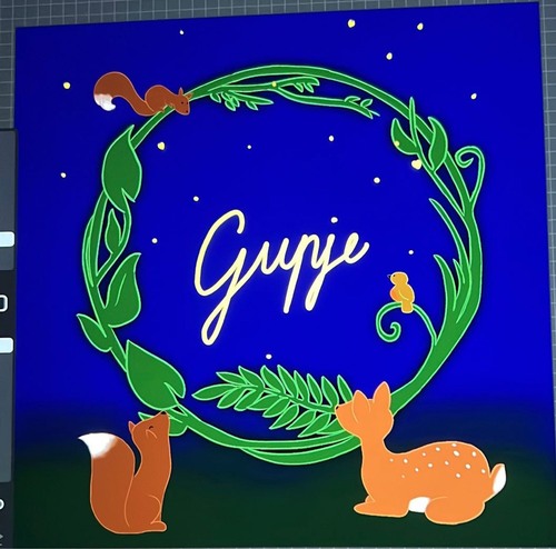 Leuk om te zien dat meer mensen creatief worden! Ik maak hem ook zelf, dit is het idee. De vuurvliegjes en de naam wil ik dan in goudfoliedruk.