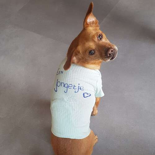 Ik heb suprise eieren gekocht van chocola, met een mesje opengemaakt en gevuld met blauwe muisjes daarna heel even op een warme pan en weer aan elkaar geplakt. En mocht je een hond hebben, rompertje van de action omdat ze geen blauwe shirtjes hadden ;p!