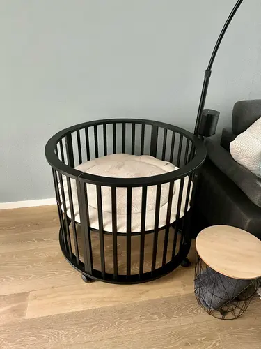 Hier ook een ronde box! Staat niet meer in de weg dan een vierkante zou doen denk ik! Wat ik wel een nadeel vind is dat er een rand om heen zit waar veel baby mobile niet op passen! Daar zou ik wel op letten x